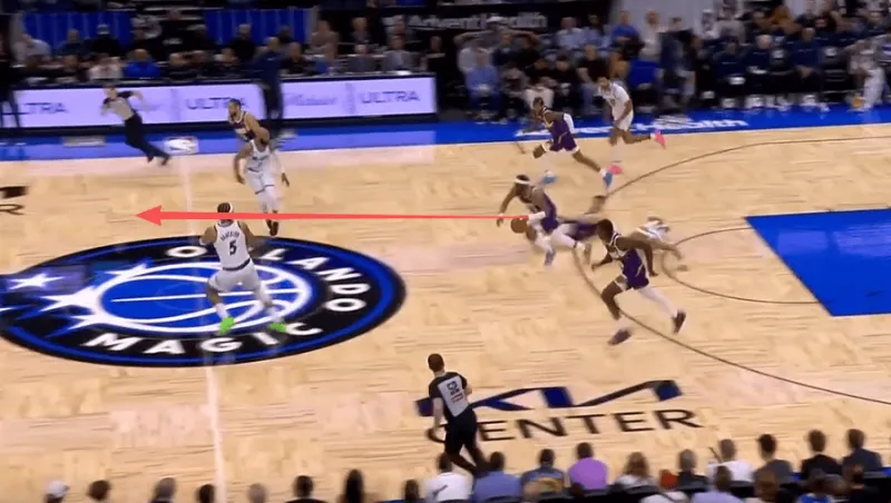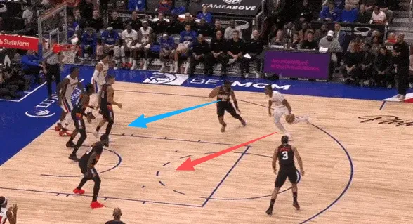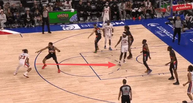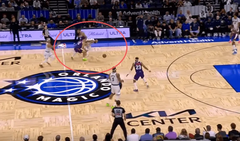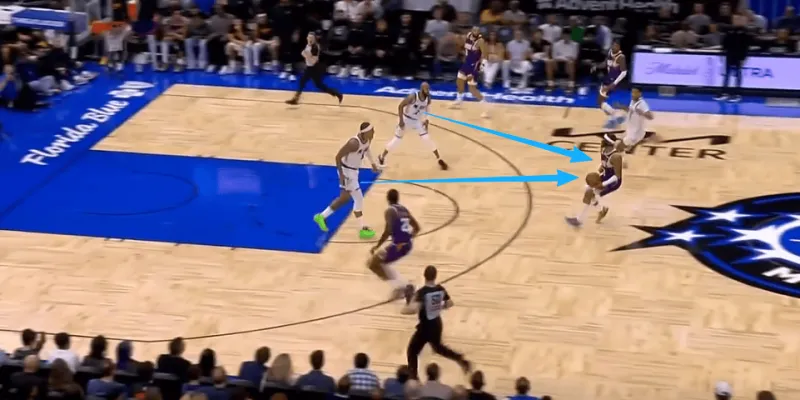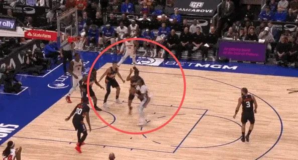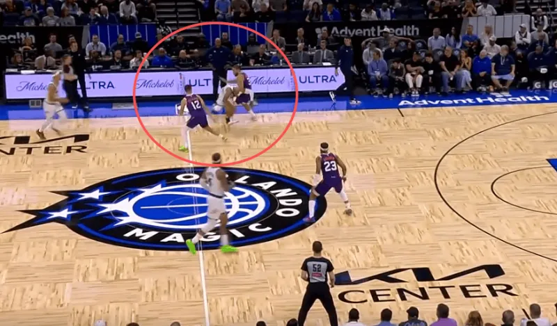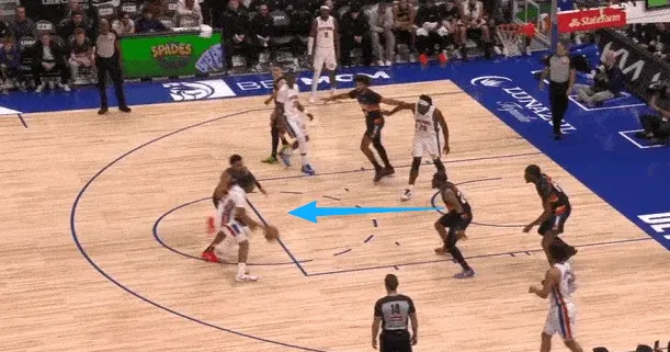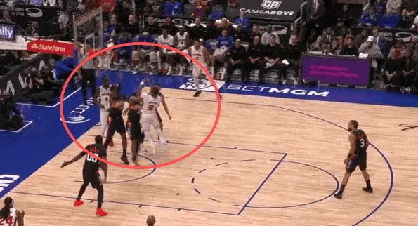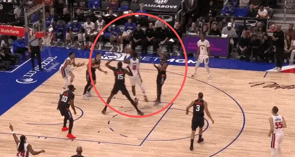 古德温先是协防骚扰持球突破杜伦,在杜伦出球后再迅速转身兼顾奥萨尔汤普森。见奥萨尔接球启动突破,立即转髋使用交叉步紧跟,
