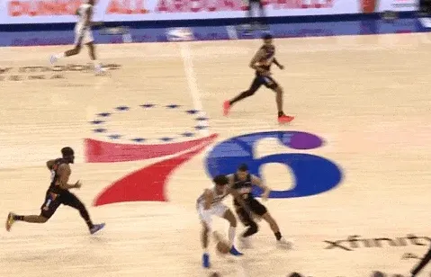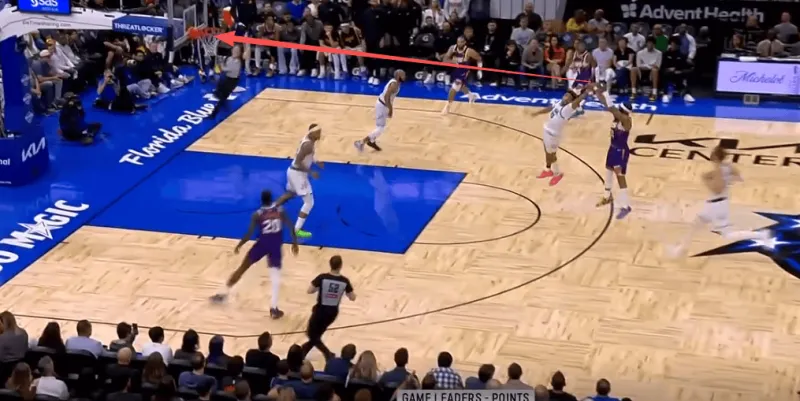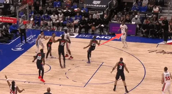 持球推进至弧顶,见自己无人看管、面前一面开阔地,赶在身侧追防的杰特霍华德到位之前,立即使用炸球一二步急停,追身三分拔起就射手起刀落打成3+1,帮球队完成完美的由守转攻。