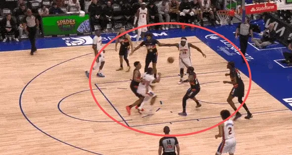 见艾维接球突破,古德温立即站住协防位置封堵突破路线,